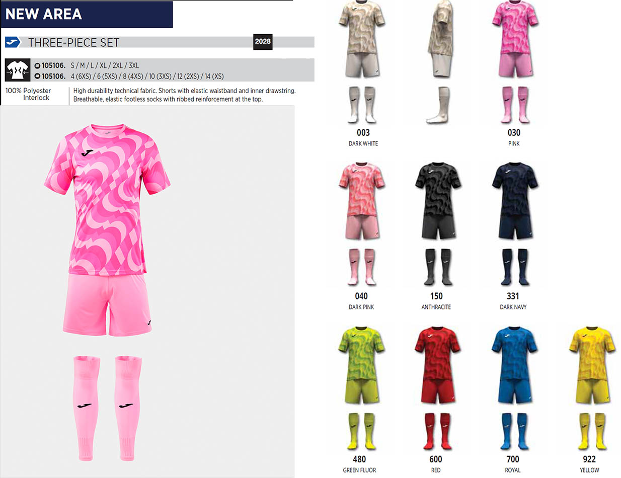 - nogometni dres set; majica s kratkimi rokavi, visoko trpežen material, hlačke z nastavljivim elastičnim pasom ter vrvico, zračne nogavice